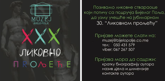 Muzej Bijelo Polje raspisao je konkurs za jubilarno 30. Bjelopoljsko likovno proljeće, koji je otvoren do 10. marta, saopštio je direktor te ustanove Željko Raičević. On je kazao da je manifestacija otvorena za sve, te da pravo učešća imaju kako akademski umjetnici, tako i autodidakti, talentovani osnovci i srednjoškolci, kao i studenti.