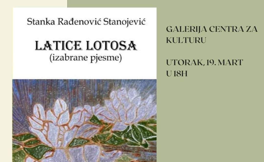 Zbirka izabranih pjesama ''Latice lotosa'', autorke Stanke Rađenović Stanojević, biće predstavljena u utorak, 19. marta, u galeriji bjelopoljskog Centra za kulturu, sa početkom u 18 časova.