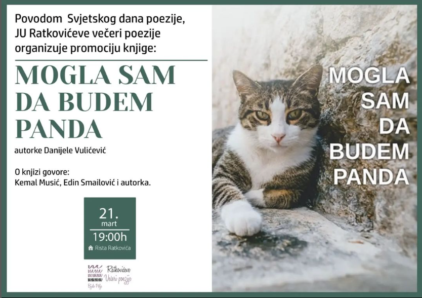 Povodom Svjetskog dana poezije, JU Ratkovićeve večeri poezije organizovaće promociju knjige „Mogla sam da budem panda“, autorke Danijele Vulićević, u četvrtak 21. marta, sa početkom u 18 časova.