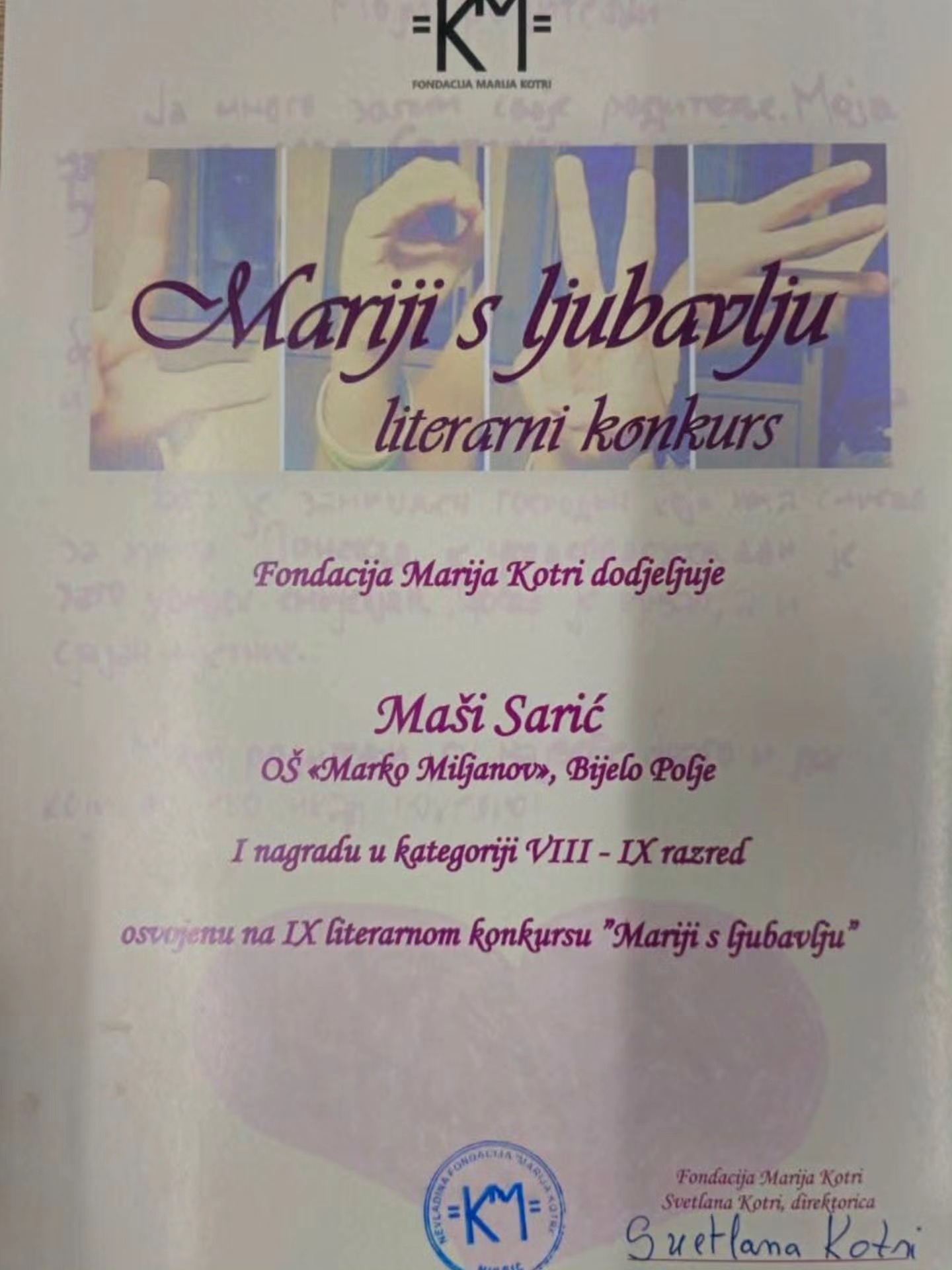 Učenica Osnovne škole ,,Marko Miljanov”, Maša Sarić, osvojila je prvu nagradu na književnom konkursu ,,Mariji s ljubavlju”, u Nikšiću.