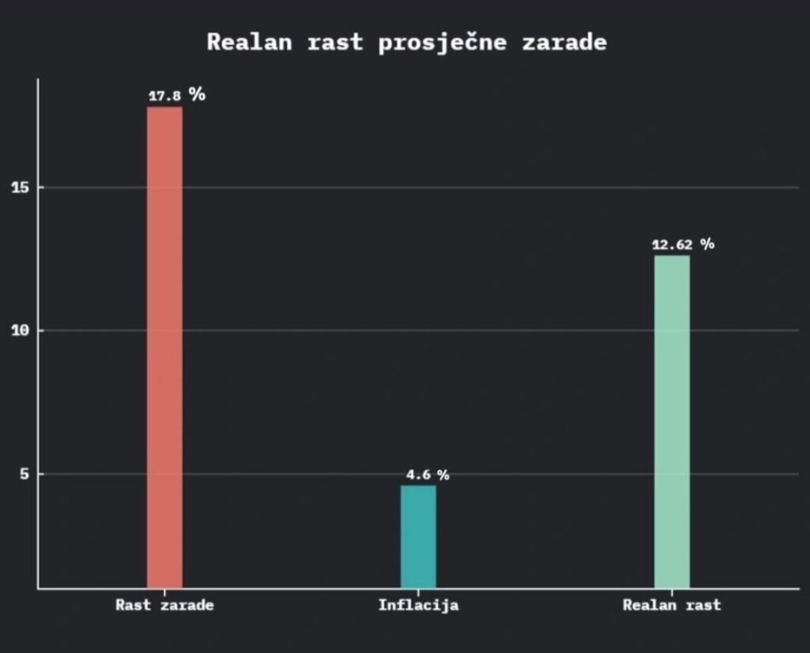 Ovi podaci pokazuju da, uprkos inflacionim pritiscima, standard života građana bilježi stvaran rast. Više sredstava za potrošnju znači da ljudi imaju veći finansijski prostor, što pozitivno utiče na domaću potražnju i ekonomiju u cjelini.Važno je naglasiti da je ovaj snažan rast plata posljedica ekonomske politike koju Crna Gora sada sprovodi u okviru Evropa Sad 2! – smanjenja poreza i povećanja plata. Ovaj model je u ekonomiji često mač sa dvije oštrice: povećava kupovnu moć i stimuliše potrošnja, ali može stvarati pritisak na budžet i inflaciju. Ipak, u periodu iza nas pokazao se kao dobar za crnogorsku ekonomiju, jer je podržao rast plata, povećao životni standard i stimulisao ekonomske aktivnosti.Održivost ovog trenda zavisi od dinamike privrednog rasta, fiskalne i monetarne politike, kao i kretanja inflacije u narednim mjesecima. Povećanje plata mora pratiti rast produktivnosti; u suprotnom, postoji rizik od novih inflacionih pritisaka i smanjenja realne kupovne moći.
