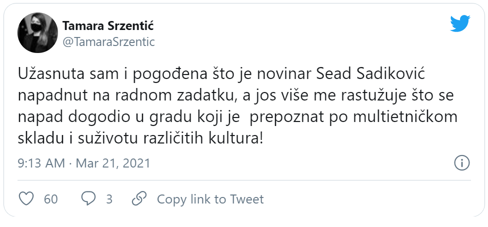 Užasnuta sam i pogođena što je novinar Sead Sadiković napadnut na radnom zadatku, a jos više me rastužuje što se napad dogodio u gradu koji je prepoznat po multietničkom skladu i suživotu različitih kultura, poručila je ministarka Tamara Srzentić.