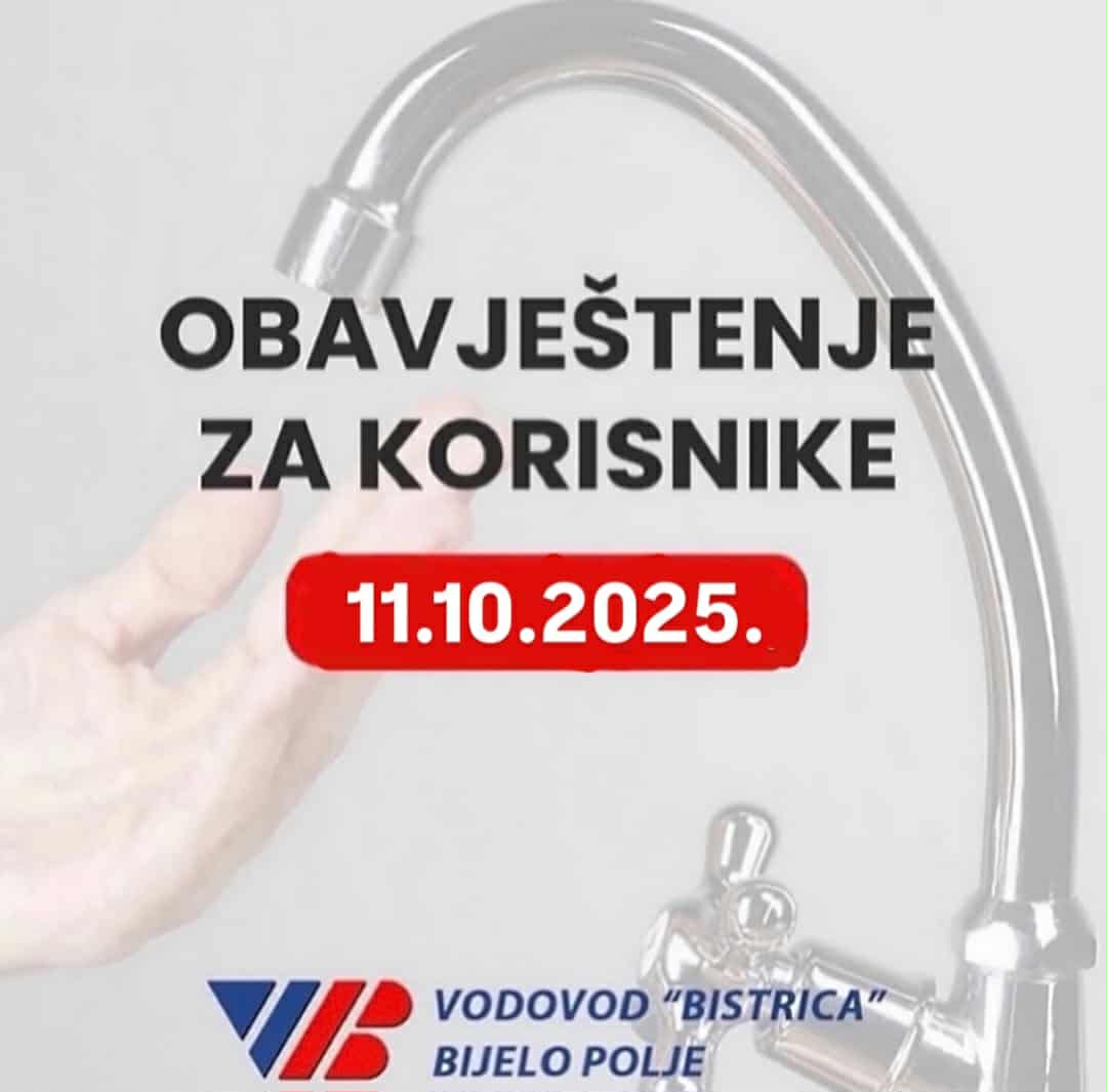 Iz Vodovoda Bistrica obavještavaju potrošače koji se snabdijevaju vodom sa pumpne stanice i rezervoara ,,Medanovići 2” da će havarija na napajanju pumpne stanice električnom energijom biti otklonjena do 13 časova, kako su, navode, dobili informacije od CEDIS-a.