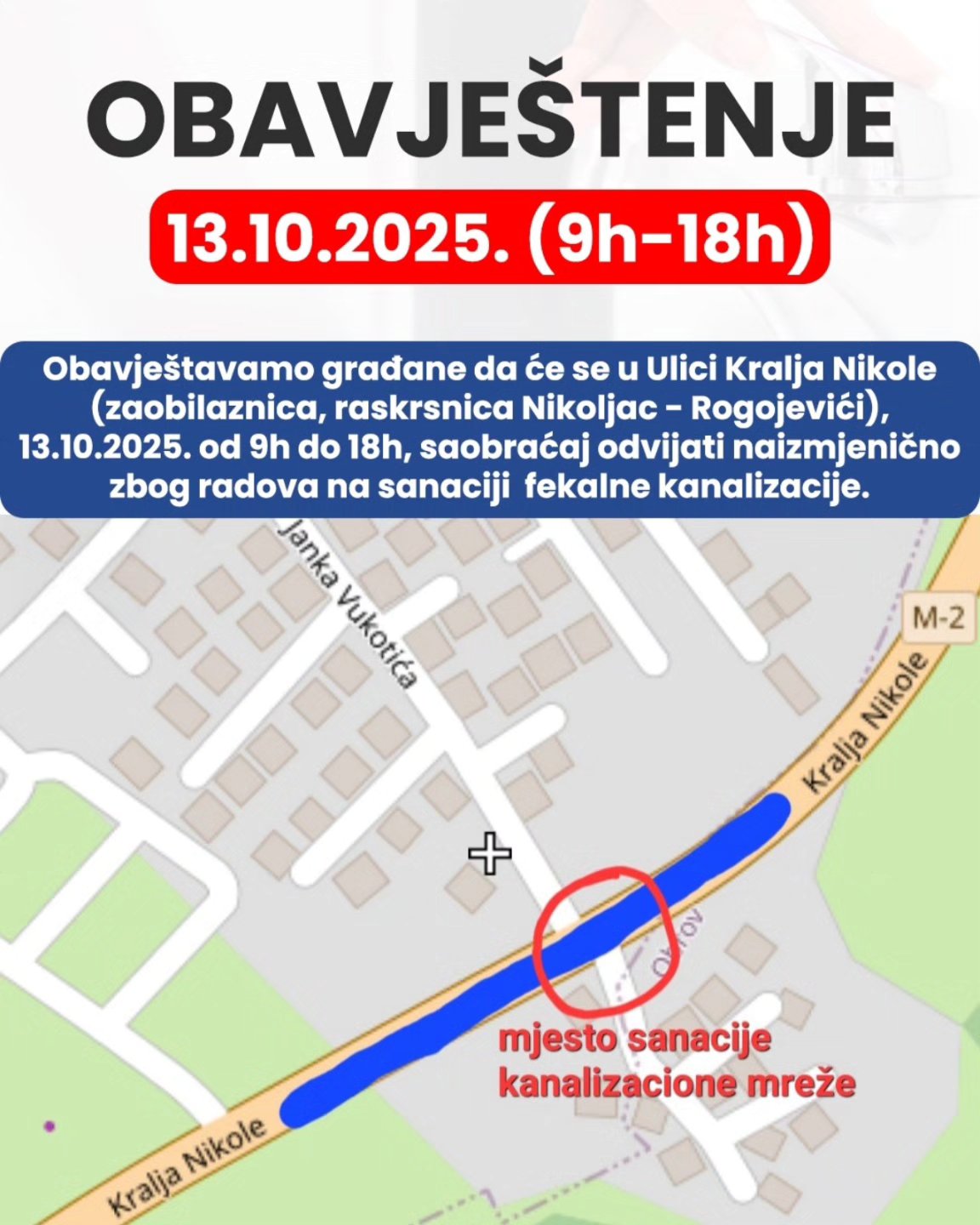 Iz Vodovoda Bistrica obavještavaju građane da će se u ponedjeljak 13. oktobra saobraćaj odvijati naizmjenično, zbog izvođenja radova na sanaciji fekalne kanalizacione mreže u dijelu saobraćajnice magistralnog puta u Ulici Kralja Nikole (zaobilaznica), kod raskrsnice za naselje Nikoljac – Rogojevići.